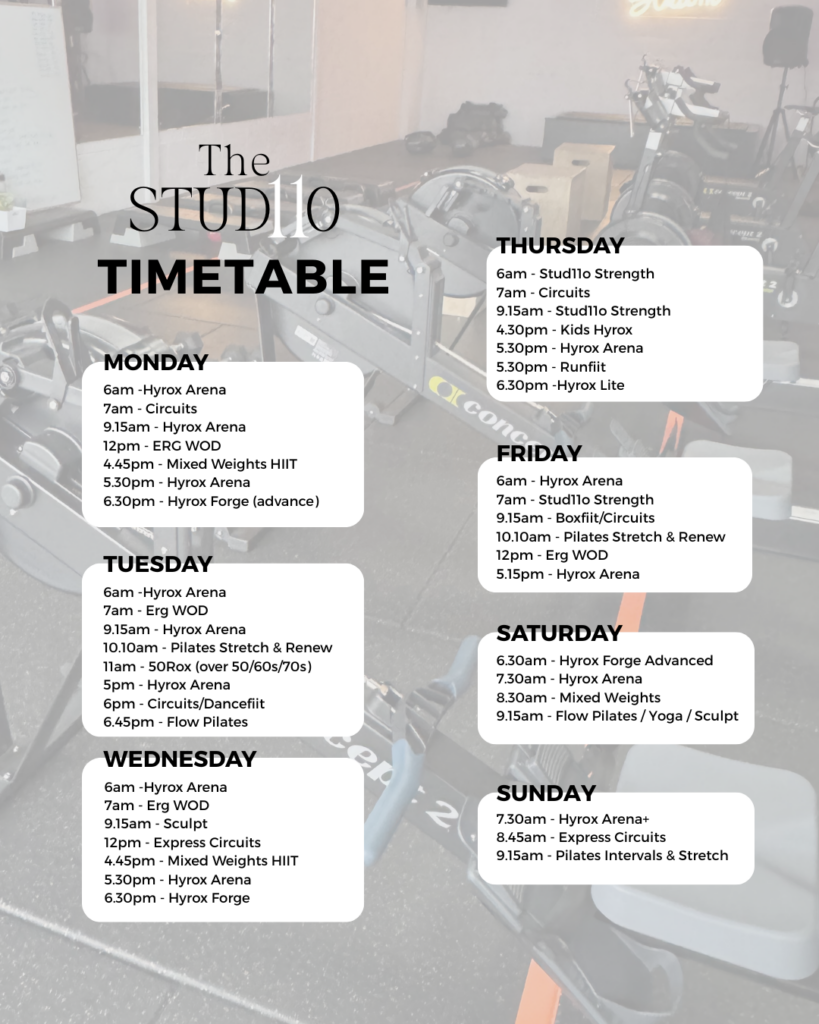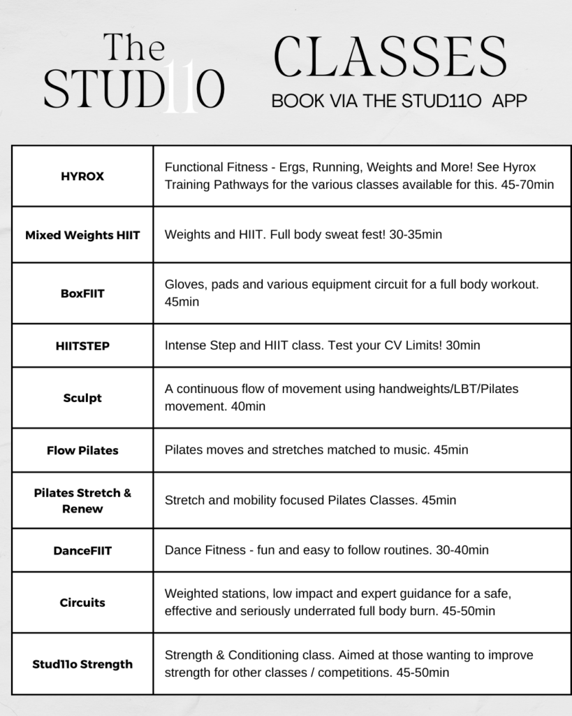 Whether you’re just starting your fitness journey, getting back into it, or are a seasoned regular, The Stud11o has everything you need to reach your goals. We offer a diverse range of fitness classes designed to improve strength, flexibility, and endurance. From Hyrox, to Circuits, Boxing to Mixed Weights HIIT and even a specially reserved session JUST for beginners – we have something for everyone.